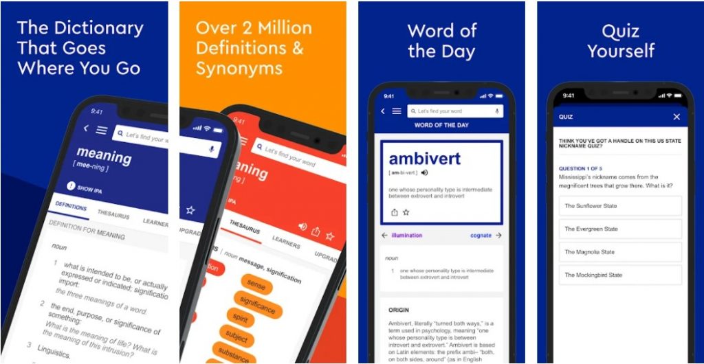 With more than 2 million trusted definitions and synonyms plus word puzzles, language quizzes, and spelling quizzes, this English dictionary and thesaurus app for Android is optimized with your mobile device in mind to help you learn English or improve your English vocabulary.